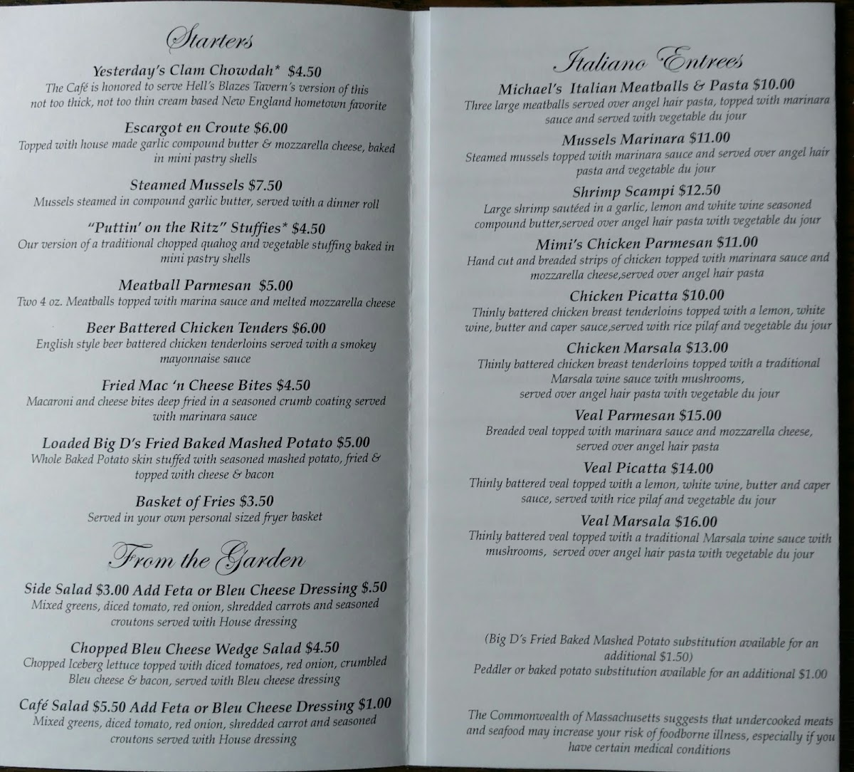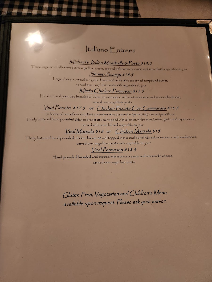 The menu features crowd-pleasers like Michael's Italian Meatballs served over angel hair pasta and mouthwatering Shrimp Scampi with a garlic, lemon, and white wine-infused butter sauce. Seafood enthusiasts can indulge in dishes such as Baked Stuffed Haddock and delectable Mussels Marinara.